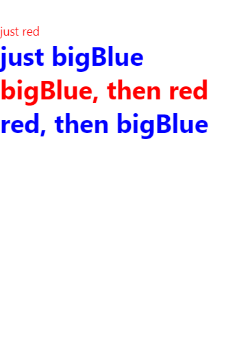 <Text style={[styles.red, styles.bigBlue]}>red, then bigBlue</Text>