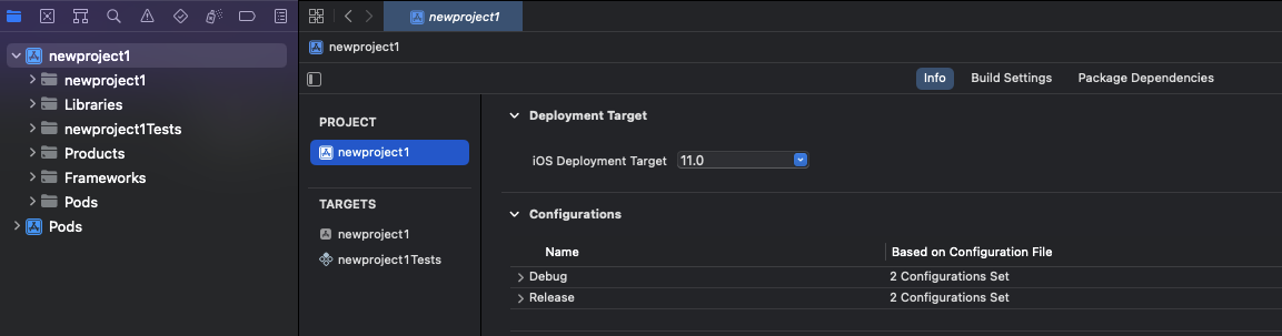 왼쪽 상단에 project명을 눌러서 Deployment Target이 아까 PodFile에서 확인한 플랫폼 버전(11.0)과 동일한지 확인한다.