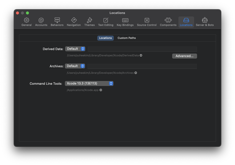 Locations에서 Command Line Tools가 비어있는 경우, Xcode x.x(버전명)을 선택해준다.