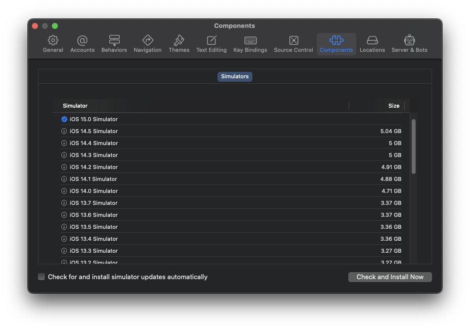 Components에서 최신 버전 iOS 시뮬레이터를 설치해준다.