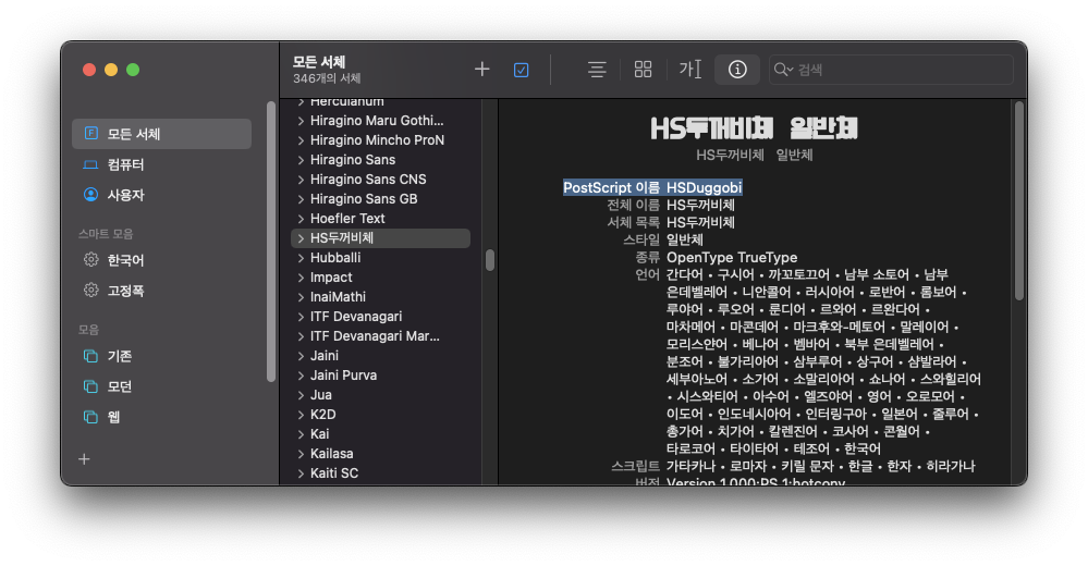 서체 관리자에 들어가서, 가장 왼쪽의 목록 중 모든 서체를 클릭하여 맥 내의 모든 서체를 불러온다.