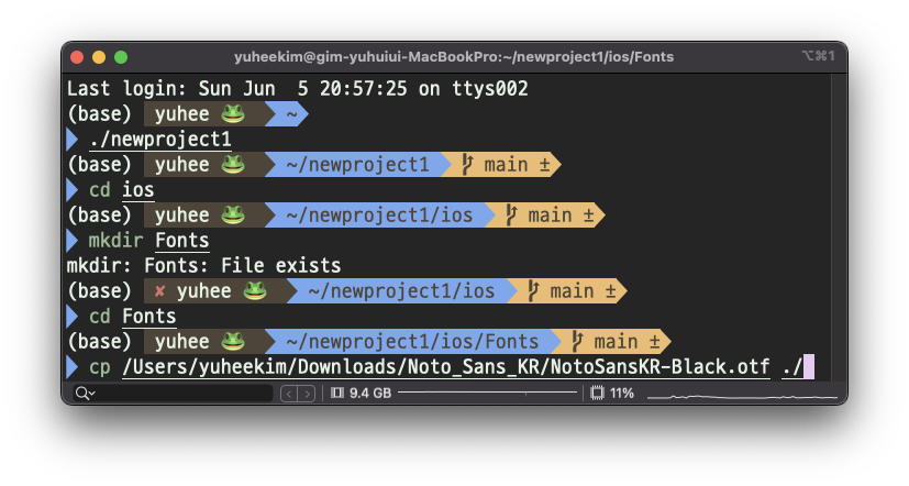 프로젝트 디렉터리로 이동하여 해당 디렉터리의 ios 파일 내에 폰트 파일을 추가해야 한다.