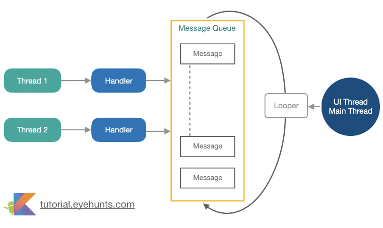 - 개발자는 메인 스레도로 전달할 Message 객체를 구성하고, 스레드의 Message Queue에 연결된 Handler를 통해 해당 메시지를 보내기만 하면 된다.