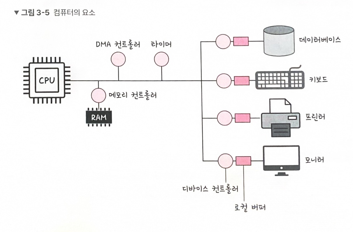 컴퓨터는 CPU, DMA 컨트롤러, 메모리, 타이머, 디바이스 컨트롤러 등으로 이루어져 있다.