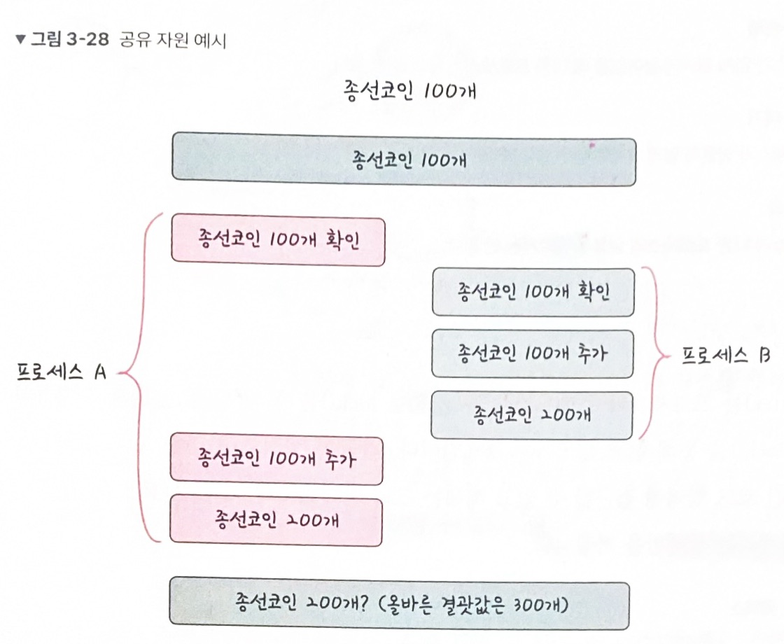 이 공유 자원을 두 개 이상의 프로세스가 동시에 읽거나 쓰는 상황을 경쟁 상태(race condition)이라 한다.