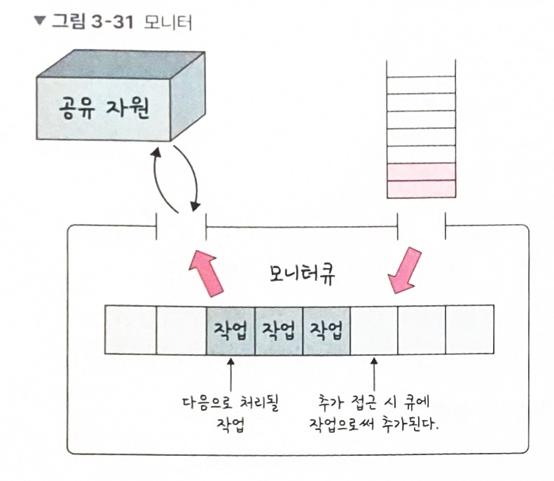 그림과 같이 모니터는 모니터 큐를 통해 공유 자원에 대한 작업을 순차적으로 처리한다.