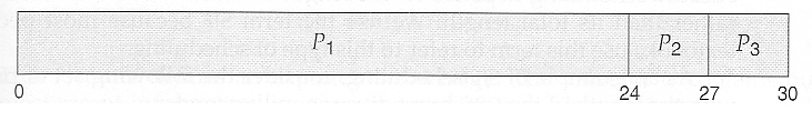 위와 같이 프로세스와 실행시간이 있고 CPU 스케줄러가 FCFS에 따라 일을 처리한다고 가정하면 다음과 같은 실행 순서를 갖게 된다.