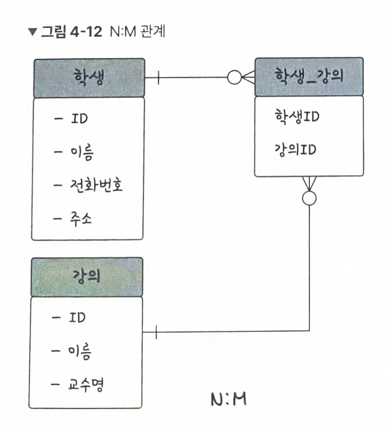 위 그림에서는 학생과 강의의 관계를 통해 N:M을 설명하고 있다.