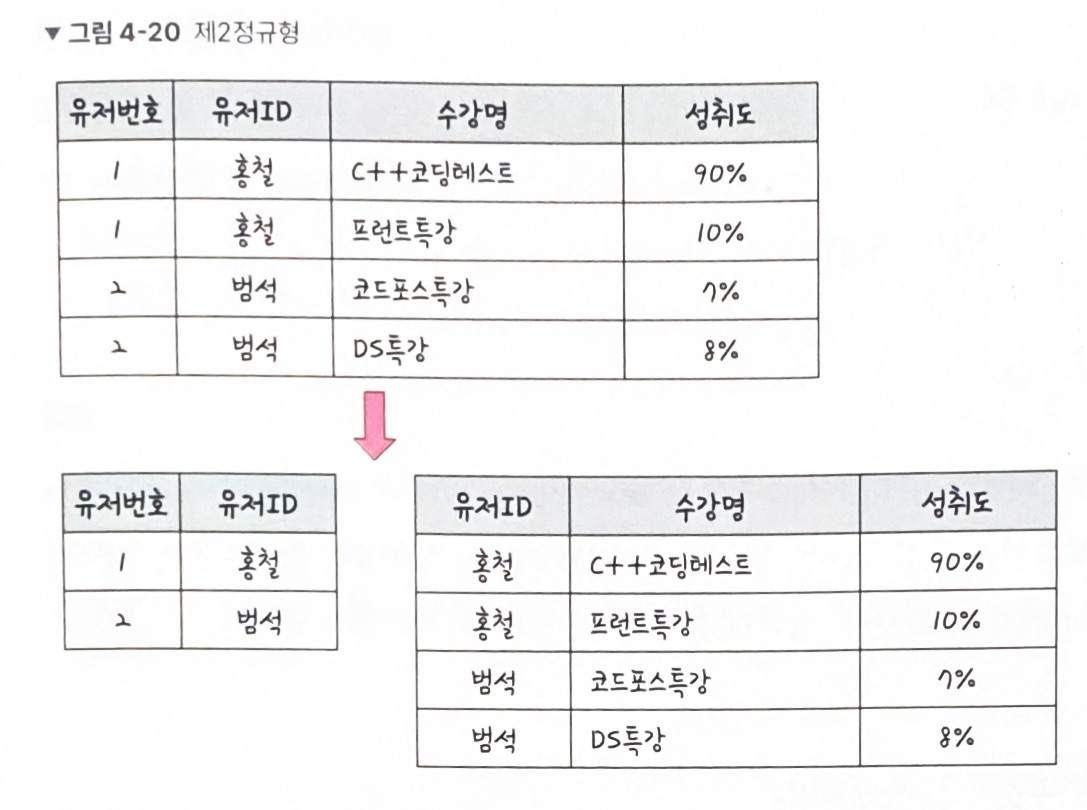 위 그림에서 제1정규형의 릴레이션은 기본키인 유저ID, 수강명에 종속되지 않은 속성이 존재한다.