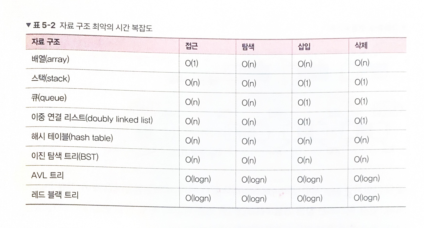 위 그림은 자료 구조에서 최악의 경우 시간 복잡도를 나타낸 것이다.